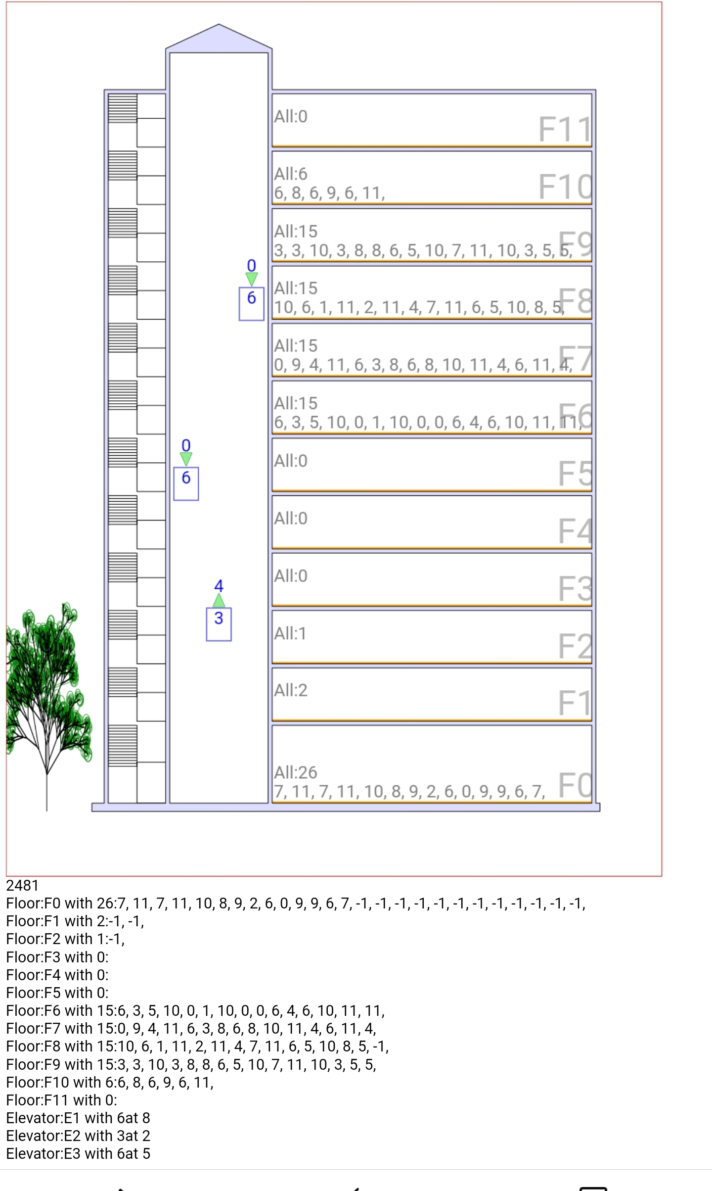 In example simulation, there are 3 elevator and 12 floors in the building. 20 persons come into building and waiting at Floor F0(ground). Floor 6 to 12 have 15 pearsons on each.