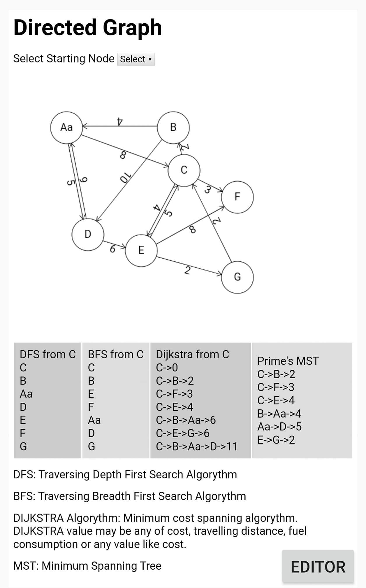 Graph is implemented using javascript associative array. Associative array represented adjacency list. Basic algorythms are prototyped and usage can be seen in example html file. HTML Canvas is drawn to show directed graph with nodes and arrowed edges. Some drawing primatives are also included for canvas drawing. Arbitrary associative array can be used as nodal property and edge's property without modifying origional Graph class. Node property array must include location and edge property need value. User may add any other properties.