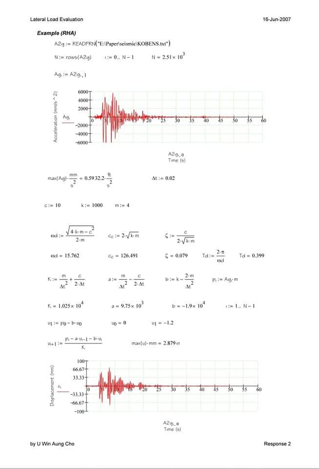 နောက်ဆုံးရရှိသော ဂရပ်ဖ်မှာ design response spectrum graph ဖြစ်ပြီး ၎င်းတွင်သတ်မှတ်သော 1s period နှင့် short period response (0.6s) acceleration များကို ဇယားများဖြင့် ဖေါ်ပြကြသည်။