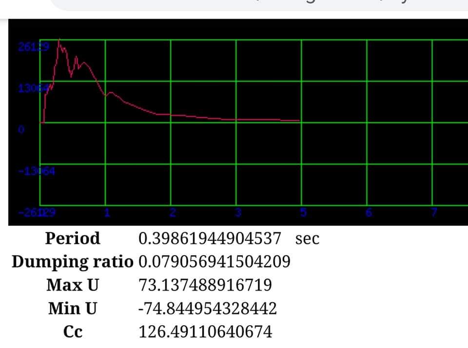 <?php $PI = +3.1415; $DT = 0.02; $accgraphname = "kobens.txt"; $C = 10; $K=1000; $M = 4; $i=0; $Ag = array(); if (file_exists($accgraphname)){ $lines = file($accgraphname); foreach($lines as $line){ $line = trim($line); if (!empty($line)){ list($dt, $ac) = explode(",", $line); $Ag[$i] = $ac; $i++; } } } $wd = sqrt(4*$K*$M-$C*$C)/(2*$M); $Cc = 2*sqrt($K*$M); $zi = $C/$Cc; $Td = 2*$PI/$wd; //$wd = sqrt(4*$K*$M-($zi*$zi*4*$K*$M))/(2*$M); //$wd = sqrt($K/$M*(1-$zi*$zi)); //$wd*$wd/(1-$zi*$zi) = $K/$M; $k = $M/($DT*$DT)+$C/(2*$DT); $a = $M/($DT*$DT)-$C/(2*$DT); $b = $K-2*$M/($DT*$DT); $p = array(); while($val = each($Ag)){ $p[] = $val[1]*$M; } $u[0] = 0; $u[1] = $p[0]-$b*$u[0]; $n = count($Ag); $umin=$umax=0; for ($i=1; $i<$n; $i++) { $u[$i+1] = ($p[$i]-$a*$u[$i-1]-$b*$u[$i])/$k; if ($umin > $u[$i+1]) $umin = $u[$i+1]; if ($umax < $u[$i+1]) $umax = $u[$i+1]; }; $imgfile = "xydata.txt"; $imgw = 680; $imgh = 200; $mgleft = $mgright = $mgtop = $mgbot = 20; $x0 = 10; $y0 = ($imgh-$mgtop-$mgbot)/2; $scx = 20; $scy = 1; $ngx = 10; $ngy = 4; $fp = fopen($imgfile, "w"); if ($fp){ fputs($fp, "$imgw|$imgh|$mgleft|$mgright|$mgtop|$mgbot|$x0|$y0|$scx|$scy|$ngx|$ngy\r\n"); fputs($fp, "$DT|$n\r\n"); fputs($fp, "$u[0]"); for ($i=1; $i<$n; $i++) { fputs($fp, ",$u[$i]"); } fclose($fp); } echo "<img src=\"xygraph.php?fname=$imgfile\">"; echo "<table>"; echo "<tr><th>Period</th><td>$Td</td><td>sec</td></tr>"; echo "<tr><th>Dumping ratio</th><td>$zi</td><td></td></tr>"; echo "<tr><th>Max U</th><td>$umax</td><td></td></tr>"; echo "<tr><th>Min U</th><td>$umin</td><td></td></tr>"; echo "<tr><th>Cc</th><td>$Cc</td><td></td></tr>"; echo "</table>"; ?>